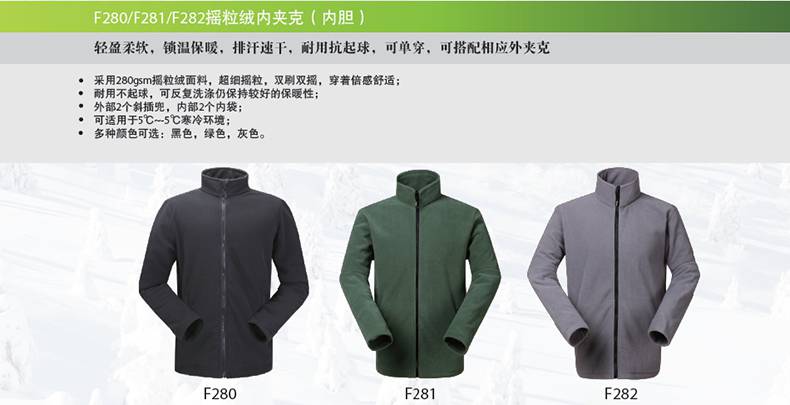 858000 F280 280gsm抗静电摇粒绒内胆 具有抗静电性,双刷双摇,不起球,可适用于5℃到-5℃环境。 S-XXXL 10件/箱