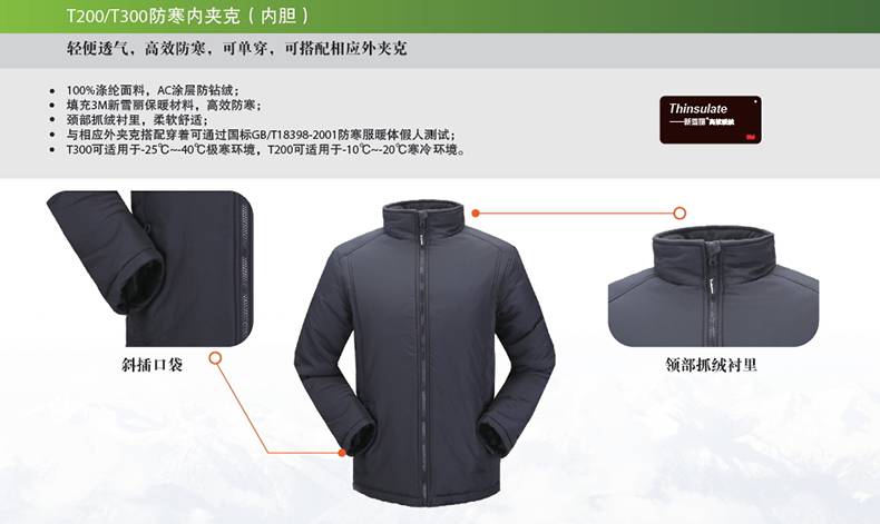 858010 T200 200gsm新雪丽内胆 AC涂层防钻绒,颈部领口抓绒内衬,可适用于-10℃到-20℃环境,通过国标GB/T18398-2001防寒服暖体测试。 S-XXXL 5件/箱